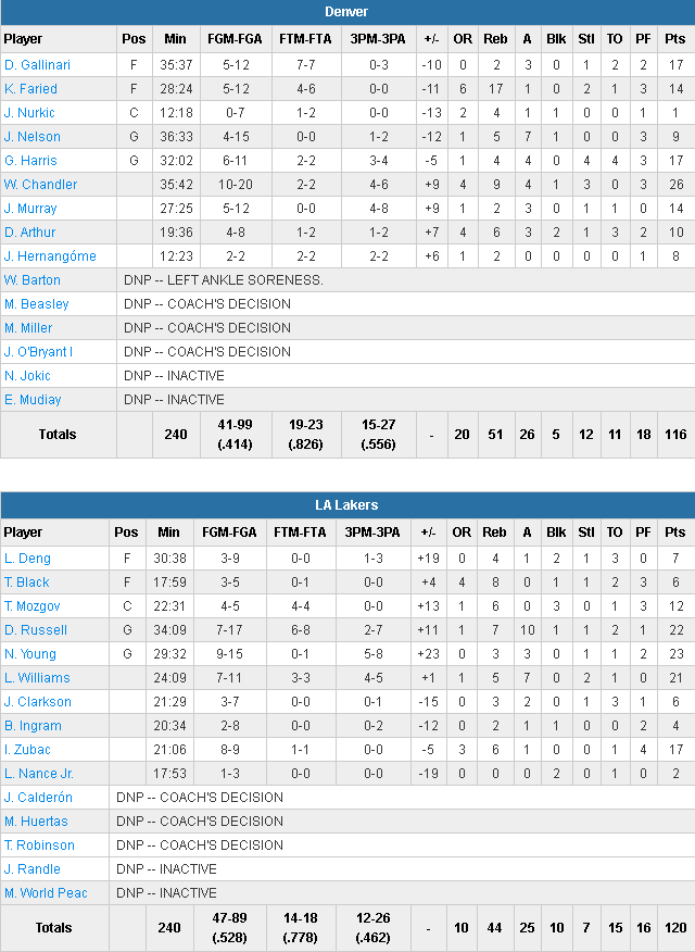 4 joueurs ont mené les Lakers, qui shootent à 52.8% contre un petit 41.4% aux Nuggets. Nick Young signe 23 points à 9/15, D’Angelo Russell, de retour, sort un double-double avec 22 points à 7/17, 7 rebonds et 10 passes, Lou Williams ajoute 21 points à 7/11 et la bonne surprise du jour c’est le rookie Ivica Zubac, auteur de 17 points à 8/9 en 21 minutes. En face Denver était toujours privé de Nikola Jokic est le meilleur joueur est Wilson Chandler, auteur de 26 points dont 12 dans le dernier quart, insuffisant pour faire pencher la décision en faveur des siens. Danilo Gallinari ajoute 17 points à 5/12, Gary Harris 17 points à 6/11 et Kenneth Faried 14 points et 17 rebonds. Ce sont ces rebonds qui ont permis à Denver de rester dans le match avec pas moins de 20 offensifs. Leur adresse extérieure (15/27) a également compensé.