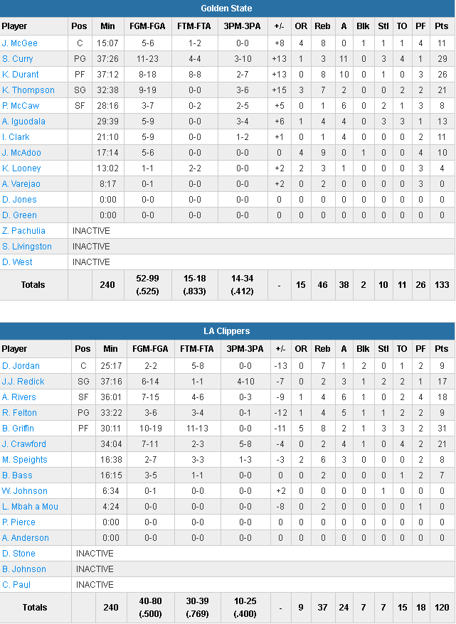 Stephen Curry a signé 29 points à 11/23 dont 3/10 à 3-pts et 11 passes alors que Kevin Durant ajoute 26 points à 8/18 et 10 passes. Klay Thompson inscrit lui 21 points à 9/19 et l’équipe shoote à 52.5% dont un 14/34 à 3-pts, ce qui est un peu mieux que les Clippers avec 50% et 10/25 à 3-pts. Draymond Green a manqué en défense pour les champions 2015 mais la bonne présence au rebond offensif (15-9) et seulement 11 ballons perdus, ont fait en partie la différence. Blake Griffin a tout tenté pour les Clippers avec 31 points à 10/19 et 8 rebonds en 30 minutes mais cela a été loin de suffire. Jamal Crawford ajoute 21 points, Austin Rivers 18 et JJ Redick 17, mais c’est la défense qui a été mise à mal.