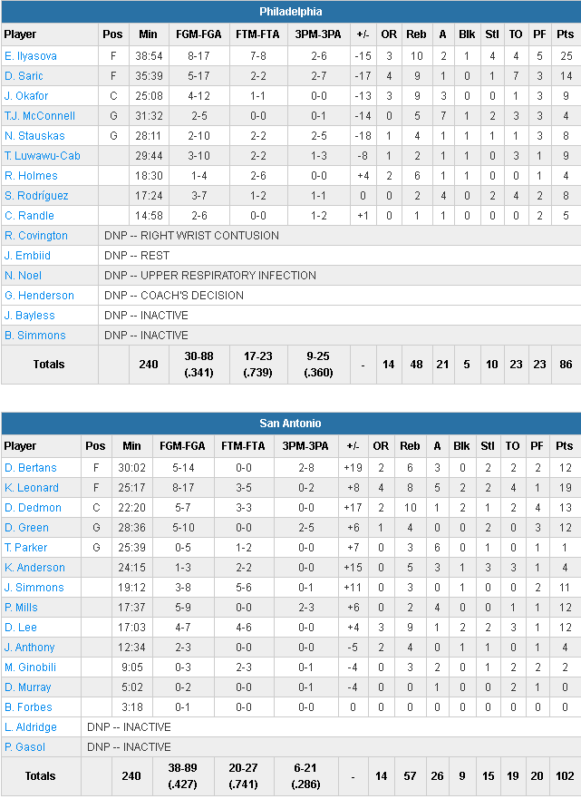 Privés de LaMarcus Aldridge, les Texans n’ont eu aucun souci face à des Sixers décimés, privés notamment de Joel Embiid, Robert Covington et Nerlens Noel. Les Spurs les ont limités à 34.1% et seuls deux joueurs atteignent les 10 points : 25 pour Ersan Ilyasova et 14 pour Dario Saric. Côté San Antonio ils sont 7 à marquer au moins 11 points, dont 19 points pour Kawhi Leonard. S’ils perdent 19 ballons, les Texans en ont provoqué 23 des 76ers. C’est la 12ème victoire de suite à domicile des Spurs sur les Sixers et la 11ème de rang dans l’ensemble.