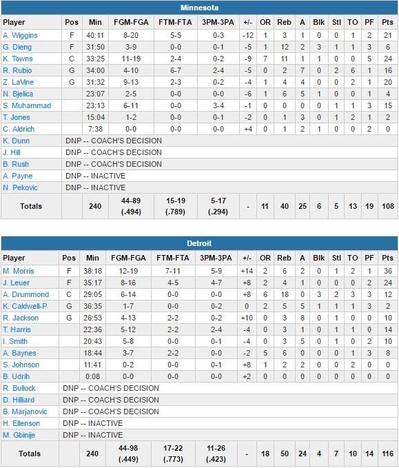 De quoi rattraper le 5/20 combiné par le backcourt titulaire Reggie Jackson – Kentavious Caldwell-Pope. Karl-Anthony Towns compile 24 points à 11/19 et 11 rebonds, Andrew Wiggins 21 points à 8/20, Zach LaVine 20 points à 9/13, 4 rebonds et 4 passes, Ricky Rubio 16 points à 4/10 et 7 passes mais Minnesota paie son 5/17 à 3-points (11/26 pour Detroit) et son déficit 50-40 au rebond malgré une large domination au niveau des points marqués dans la raquette (60 à 36). Andre Drummond signe 12 points à 6/14, 18 rebonds et 3 contres.