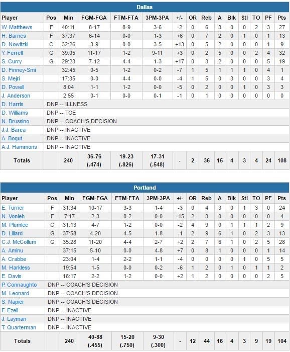 Dallas a pris jusqu’à 24 points d’avance dans le match avant de voir les locaux revenir à égalité. Wesley Matthews marque 27 points pour les Mavs. McCollum termine lui meilleur marqueur de Portland avec 28 points et les buzzer beaters du 2ème et 3ème quart-temps. Evan Turner ajoute 24 points alors que Damian Lillard est limité à 13 points à 4/20, 9 rebonds et 6 passes. Après avoir démarré sa saison sur un 4/17, Dallas a remporté 8 de ses 11 derniers matchs et 4 rencontres d’affilée. Rick Carlisle et ses joueurs peuvent se mettre à rêver de playoffs.