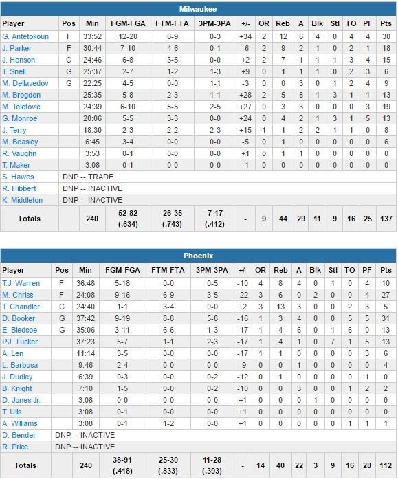 Mauvaise nouvelle pour les Suns, Booker ne marquera pas un point en seconde mi-temps, avec un 0/6 aux tirs. Milwaukee accroît alors tranquillement son avance et mène 92-76 après un dunk de Parker à 4’35. Phoenix ne reviendra plus en-dessous des 10 points. Un 2+1 de Chriss réduira l’écart à 104-92 à 10’59 de la fin mais Milwaukee répond par un 8-0 (112-92).