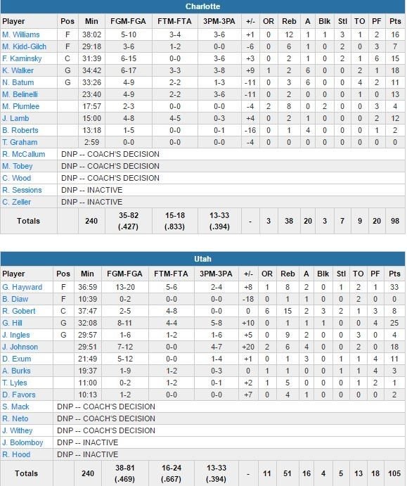 Très adroits dans le 3ème quart-temps longue distance, les Hornets (dominés 51-38 au rebond) vont perdre leur adresse durant les 12 dernières minutes et n’inscriront que 16 points. Kemba Walker (malade, il ne s’était pas entraîné mercredi mais a joué) termine meilleur marqueur de Charlotte avec 18 points, suivi par Marvin Williams (16 points et 12 rebonds) et Frank Kaminsky (15 points). Nicolas Batum est lui limité à 11 points à 4/9, 3 rebonds et 6 passes. Le Jazz rejoint ses vestiaires en tête 52-44 après avoir pris 10 points de retard dans le 1er quart-temps. Dante Exum a relancé les siens avec 9 points durant un 15-0 pour passer devant 31-28. Utah boucle sa 1ère mi-temps sur un 9-2, série qui sera marquée par le alley oop claqué par Hayward (maître du stepback et du pull-up en fin de match) et servi par le jeune meneur australien.