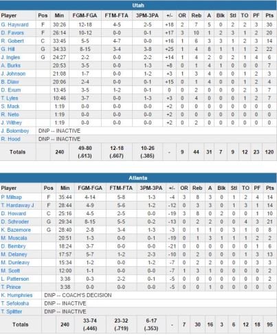 Dennis Schröder termine meilleur marqueur d’Atlanta (qui se spécialisent dans les défaites en mode raclée ces derniers temps après avoir pris 23 points ou plus contre Detroit, Washington et maintenant Utah) avec 21 points. Côté Jazz Rudy Gobert signe 14 points à 5/5, 6 rebonds, 3 passes et 3 contres face à un Dwight Howard à seulement 10 points à 4/5, 8 rebonds et 2 contres. Derrick Favors bat lui son record en saison avec 20 points et 10 rebons après avoir manqué les 2 dernières rencontres de son équipe (repos).