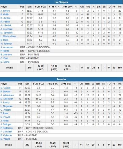 Absent de 7 des 8 derniers matchs de son équipe, DeMar DeRozan (cheville) était de retour pour la réception des Clippers cette nuit et ses 31 points à 11/22 ont permis aux Raptors de surmonter le triple-double de Blake Griffin (26 points à 11/19, 11 rebonds et 11 passes) pour une victoire 118-109.