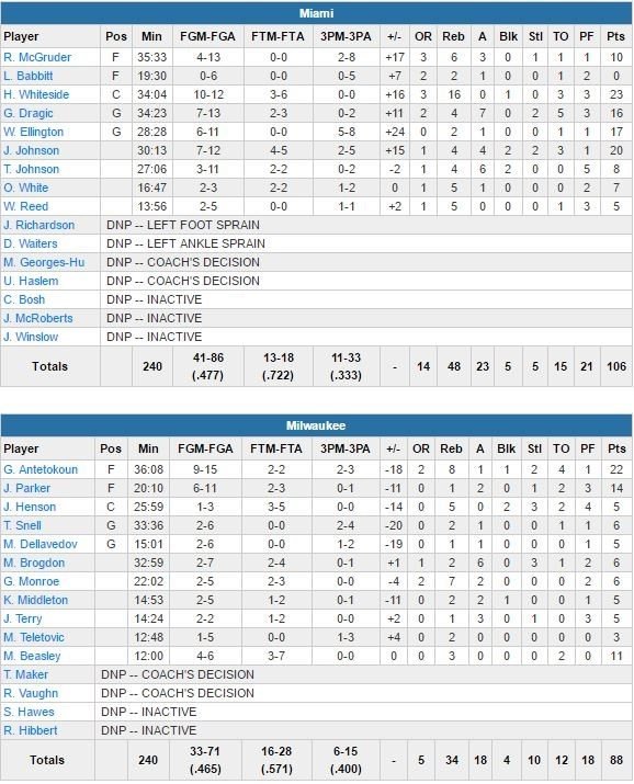 Miami (sans Dion Waiters, victime d’une entorse de la cheville lors d’une victoire lundi dans le Minnesota) démarre son match sur un 15-2 et tient les Bucks à 33% de réussite dans le 1er quart-temps. Whiteside domine la 1ère mi-temps avec 17 points et 11 rebonds et le Heat est devant 55-44 à la pause. Goran Dragic inscrit 13 de ses 16 points en 1ère mi-temps, pénétrant à sa guise dans la défense intérieure trop soft de Milwaukee. Menés de 11 points au moment de la sortie de Parker, les Bucks vont maintenir une avance d’au moins 10 points jusqu’à la fin du match à partir de là.