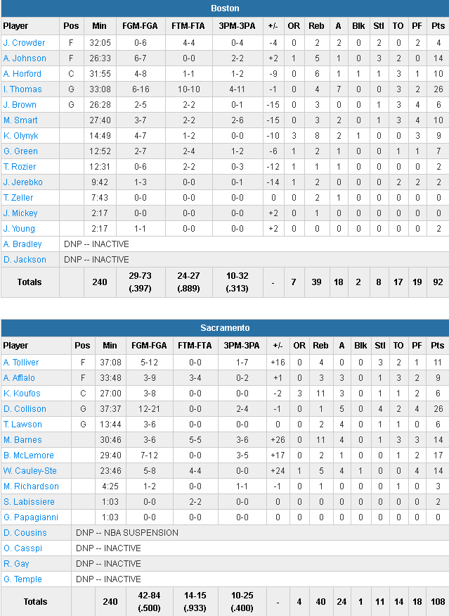 Privés de DeMarcus Cousins, suspendu, on donnait peu de chances aux Kings face à une des équipes en forme de la ligue : les Celtics. Ils se sont pourtant imposés avec la manière 108-92. Ils mettent ainsi fin à la série de 7 victoires des Celtics pour porter leur bilan à 21-32 conter 33-19 pour Boston.