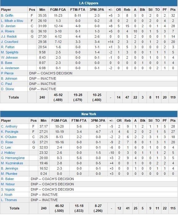 Les Knicks se sont bien battus au Madison Square Garden cette nuit mais le record en saison de Blake Griffin (32 points à 11/23, 8 rebonds et 5 passes) en plus de l’énorme match de DeAndre Jordan (28 points à 12/14, 15 rebonds et 2 contres) ont été de trop et New York s’incline 119-115.