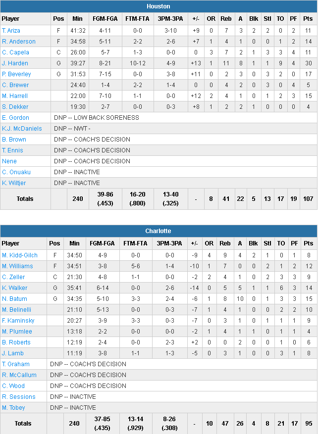 Harden a signé 30 points à 8/21, 11 rebonds, 8 passes et 9 ballons perdus pour mener les siens, dont la performance défensive a été bonne. Ils ont notamment provoqué 22 ballons perdus qui ont mené à 27 points. En sortie de banc Pat Beverley ajoute 17 points et Montrezl Harrell 15 points. Ryan Anderson marque 14 points pour des Rockets à 45.3% au tir dont un 13/40 à 3-pts. Nicolas Batum frôle le triple-double côté Hornets avec 15 points, 8 rebonds et 10 passes mais Kemba Walker marque seulement 14 points à 6/14 et l’équipe shoote à 43.5%.