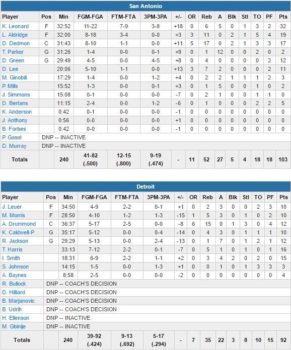 Sept joueurs de Detroit (qui restait sur 7 victoires en 8 matchs à domicile) signent au moins 10 points, Tobias Harris en tête avec 16 points à 7/12 et 5 rebonds, Stanley Johnson 2ème meilleur marqueur avec 15 points à 6/9, 3 rebonds, 4 passes et 2 contres et Andre Drummond en double-double avec 12 points et 15 rebonds. San Antonio domine le 1er quart-temps 27-19 et termine le 2ème sur un 12-2 pour mener de 19 points à la mi-temps, 60-41. La seconde mi-temps ne sera ensuite qu’une formalité pour les Spurs, qui n’auront qu’à se contenter de maintenir un écart suffisant.