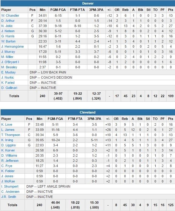 À noter : signé pour 10 jours en début de semaine, le 2ème choix de la draft 2011 Derrick Williams a joué 20 minutes (notamment en tant que meneur de jeu) pour 7 points à 2/3 et 1 rebond. Malgré 6 maillots d’équipes déjà portés en NBA, il n’avait encore jamais joué pour une franchise au bilan positif. Kenneth Faried (entorse de la cheville gauche) et Danilo Gallinari (aine) n’ont pas joué pour Denver. Tristan Thompson signe 13 points et 13 rebonds pour les Cavaliers. James est devenu le 2ème meilleur rebondeur de la franchise devant Brad Daugherty (5227). Zydrunas Ilgauskas est premier avec 5904 rebonds.