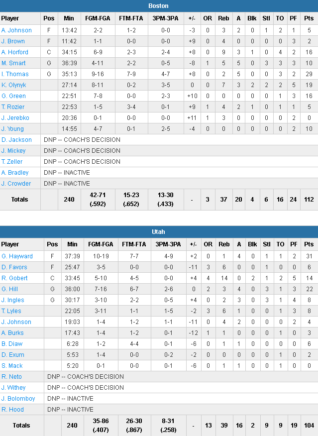 D’entrée le Jazz a été mis en difficulté par l’attaque de Boston, qui a de suite attaqué la raquette et parfaitement alterné jeu intérieur-extérieur. Olynyk a donné à Boston sa première avant de 10 points (33-23) lorsqu’il a terminé le quart avec un 3-pts et un layup au buzzer. Le Jazz est revenu à 7 points sur un dunk de Derrick Favors en début de second quart mais Boston a répliqué par un 10-0 pour s’envoler, 47-30 puis 58-44 après 24 minutes. Le Jazz s’est accroché et sur un dunk de Rudy Gobert, l’écart est passé à nouveau sous les 10 points (64-56) mais encore une fois Boston a répliqué, notamment avec un 3-pts d’Olynyk et un layup puis un 3-pt s de James Young. Le score est passé à 72-58 puis 85-65 en début de dernier acte sur un 8-0 sous l’impulsion de Thomas et Horford. Les hommes de Quin Snyder ont tenté un retour et ils ont réussi à revenir à 6 points (108-102) sur un 3-pts d’Hayward à 22 secondes de la fin mais Boston a assuré sur la ligne des lancers.