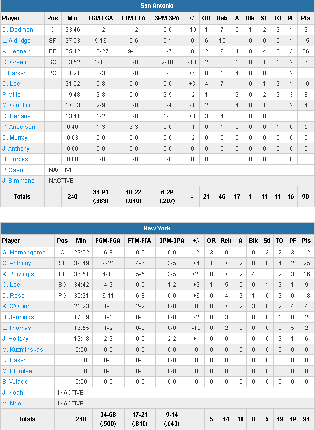 Les deux équipes ont multiplié les échecs et l’écart s’est maintenu à 5 points, 76-71 à 7 minutes de la fin. Les deux équipes ont continué de se répondre avec un écart qui a oscillé entre 3 et 5 points, 80-77 à 4’30 du buzzer pour NY. Finalement Leonard et Aldridge ont remis les deux équipes à égalité sur un 7-2 avec 3’30 à jouer. Mais les Knicks ont répondu par un 5-0 avec notamment une contre-attaque texane foirée qui s’est transformée en shoot à 3-pts ouvert de Melo, +5. Leonard a tenu les Spurs en vie pour les ramener à 2 points à 90 secondes du buzzer mais Melo a plié le match sur deux paniers consécutifs.