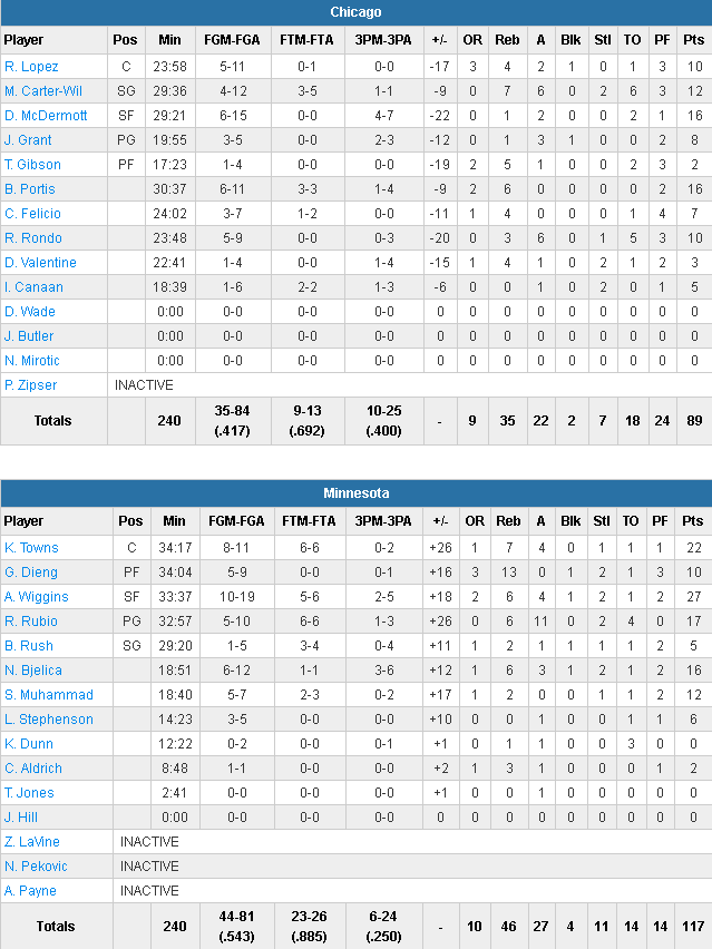 Les jeunes Wolves ont été menées par Andrew Wiggins (27 points à 10/19), Karl-Anthony Towns (22 points à 8/11) et Ricky Rubio (17 points et 11 passes). Ils ont mis la défense des Bulls au supplice avec 54.3% au shoot contre seulement 41.7% aux Bulls. Ces derniers ont été dominés de la tête et des épaules avec comme meilleurs marqueurs Bobby Portis et Doug McDermott, auteurs de 16 points chacun.
