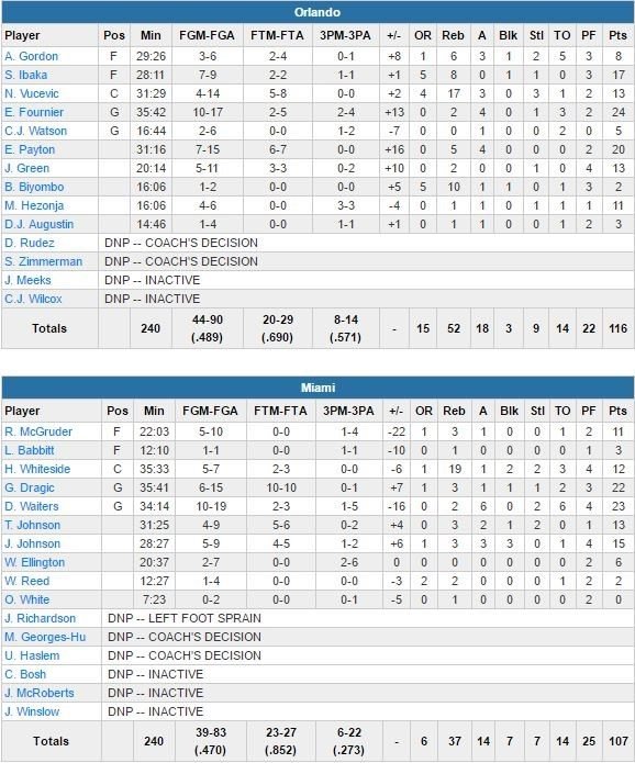 Elfrid Payton ajoute 20 points (7/15, 5 rebonds et 4 passes), Serge Ibaka 17 (7/9, 8 rebonds) et Nikola Vucevic 13 points (4/14) et 17 rebonds. Dion Waiters, de retour d’une entorse de la cheville, termine meilleur marqueur de Miami (qui restait sur 8 victoires d’affilée à domicile) avec 23 points à 10/19 et 10 passes. Goran Dragic suit avec 22 points, James Johnson 15 et Hassan Whiteside (12 points) capte 19 rebonds pour un Heat pourtant dominé 52-37 dans le domaine (Erik Spoelstra l’a sorti du match après 3 minutes de jeu alors que l’équipe était dominée 9-1 au rebond et 10-2 au score). Miami n’aura mené que pendant 21 secondes au total sur les 3 premiers quarts-temps, puis 1’57 dans le 4ème.