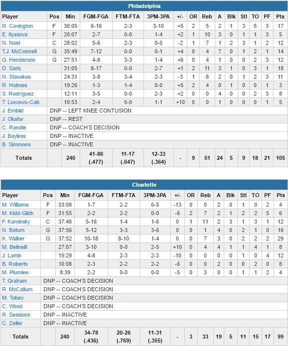 Robert Covington ajoute 17 points pour les Sixers, T.J. McConnell 14 points et 7 passes. Kemba Walker termine lui à 29 points à 10/18, 7 rebonds et 3 passes mais Charlotte s’incline pour la 2ème fois contre les Sixers cette saison. L’équipe de Brett Brown menait de 8 points avant de jouer le 4ème quart-temps puis a étendu son avance à 98-84 sur un layup signé McConnell. Les Hornets recolleront à 6 points à moins d’une minute de la fin sur un shoot de Walker. Batum aura ensuite l’occasion de réduire un peu plus l’écart suite à une interception sur Gerald Henderson mais la tentative à 3-points du Français rebondit sur le cercle avant de sortir. Timothé Luwawu-Cabarrot joue 10 minutes pour 5 points à 2/4.
