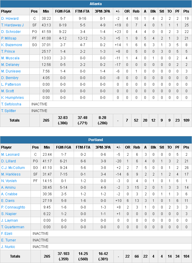 Les Hawks se sont appuyés sur un quatuor Paul Millsap (21 points à 4/12, 9 rebonds, 5 passes et 4 contres), Tim Hardaway Jr. (25 points à 8/19 et 7 rebonds), Dwight Howard (19 points, 16 rebonds et 4 contres) et Dennis Schröder (22 points à 9/22 et 4 passes). Dans ce match où l’adresse n’était pas du tout au rendez-vous avec 38.6% pour Atlanta et 35.9% aux Blazers. Les Hawks ont compensé avec 48 lancers francs tentés alors que Portland a pris 22 rebonds offensifs. Ces derniers ont été menés par leur duo habituel, mais il a arrosé avec 21 points à 6/21 pour Damian Lillard et 26 points à 9/24 pour CJ McCollum.