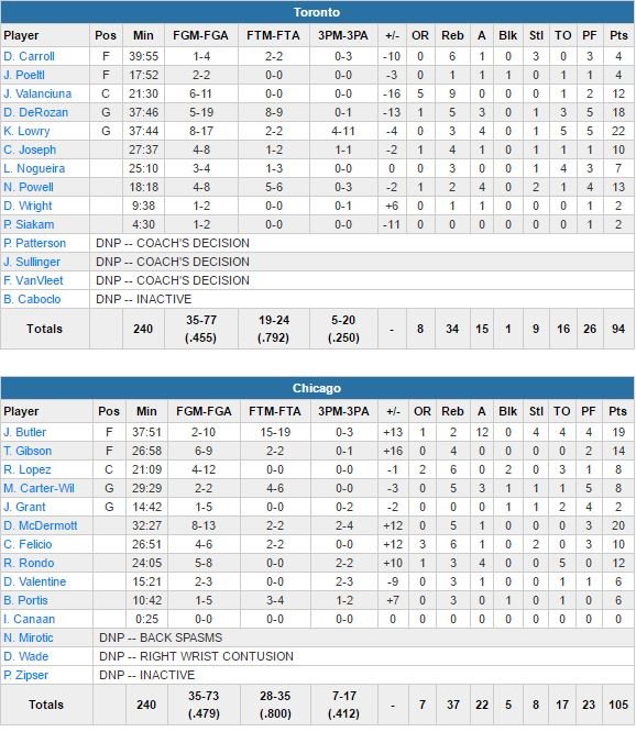 Chicago score les 6 derniers points du 1er quart-temps pour passer devant 24-18. Les Bulls prennent leur plus grosse avance de la 1ère mi-temps sur 2 lancers-francs de Butler à 1’44, 56-35. Gibson inscrit lui la totalité de ses points sur les 2 premiers quarts et Chicago mène 58-39 à la pause en shootant à 51%. Les Raptors domineront ensuite la seconde mi-temps 55-47 mais ce ne sera pas suffisant pour espérer rattraper leur gros retard.