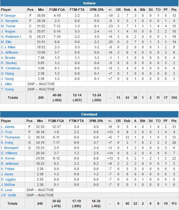 Menés de 10 points dans le 3ème quart-temps, les Pacers (12/24 à 3-points contre 18/39 pour les Cavaliers) parviennent à égaliser sur un 3-points de Robinson. Korver, déjà auteur d’un 8/9 à 3-points le 8 février contre cette même équipe, répond avec tir longue distance, tout comme Irving sur la possession suivante. Les deux rentrent deux tirs primés supplémentaires dans la foulée pour reprendre 10 points d’avance (97-87) puis Korver ajoute un nouveau 3-points et un layup pour le +17, 106-89.