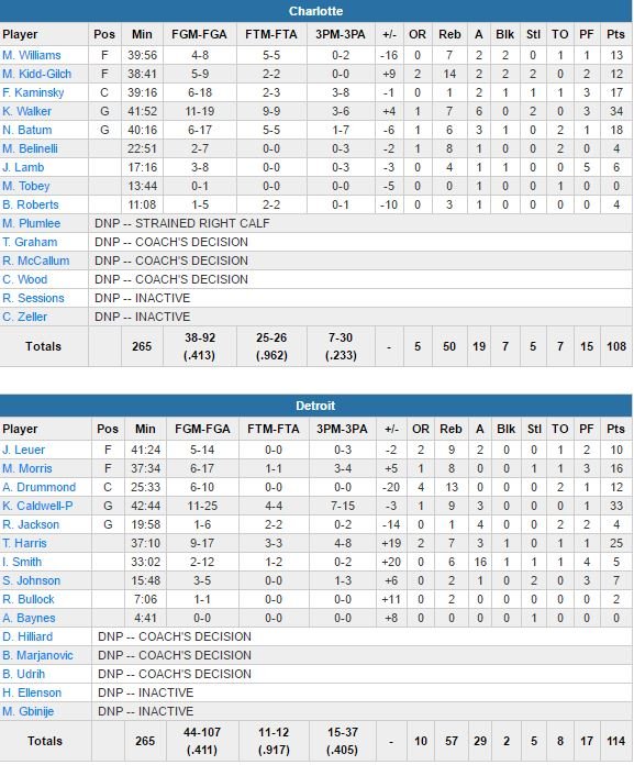 À noter : Charlotte était devant 85-70 en début de 4ème quart-temps mais a manqué 14 de ses 15 premiers shoots sur la période. Tobias Harris ajoute 25 points pour Detroit. Charlotte était sans Cody Zeller (quadriceps). Nicolas Batum signe 18 points à 6/17, 6 rebonds et 3 passes. Andre Drummond termine à 12 points et 13 rebonds.