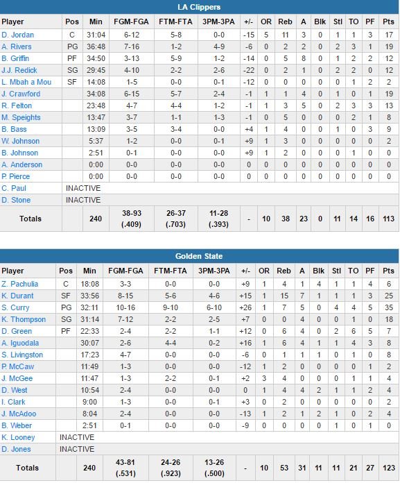 Curry termine à 35 points à 10/16 et 6/10 à 3-points, 7 rebonds, 5 passes et 4 interceptions. Lui et Kevin Durant (25 points à 8/15, 15 rebonds et 7 passes) combinent pour 8 des 9 trois-points des Warriors dans ce 3ème quart de folie. En retard 61-49 à la mi-temps, les hommes de Steve Kerr vont planter 50 points au retour des vestiaires, le premier quart-temps à 50 points ou plus depuis que les Lakers avaient signé 51 points contre les Knicks en une seule période le 25 mars 2014. Austin Rivers et Jamal Crawford signe 19 points chacun pour Los Angeles, DeAndre Jordan ajoute 17 points et 11 rebonds alors que Blake Griffin est limité à 12 points à 3/13, 5 rebonds et 8 passes.