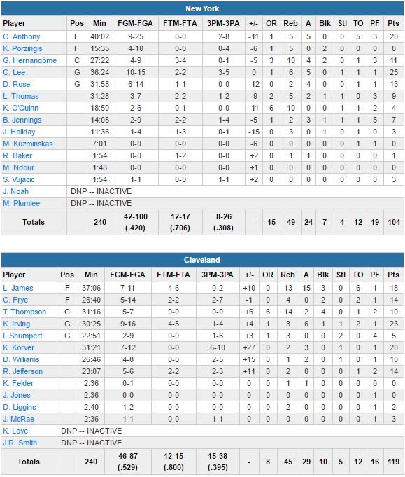Côté Knicks, Courtney Lee termine meilleur marqueur avec 25 points à 10/15, 6 rebonds et 5 passes, Carmelo Anthony suit avec 20 points à 9/25, 5 rebonds et 5 passes mais l’équipe perd une 6ème rencontre en 7 matchs et Kristaps Porzingis, sorti pour une entorse de la cheville droite dans le 2ème quart-temps. New York a brièvement mené en début de match avant d’encaisser un 25-8 des Cavaliers pour terminer la 1ère mi-temps. Cleveland s’éloigne ensuite (72-51) mais Melo, 8 points dans le 3ème, permet aux Knicks (menés 87-79 à l’entame du 4ème) de rester en vie.