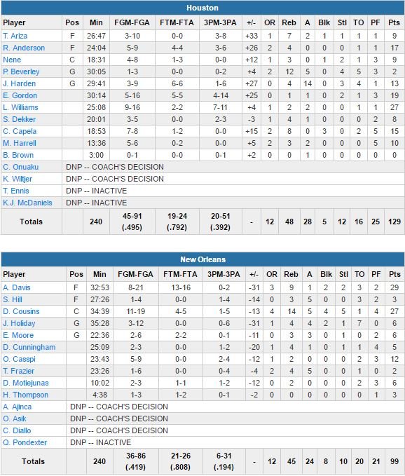 Cousins et Davis inscrivent chacun 8 points dans le 1er quart-temps mais l’équipe perd 12 ballons en 1ère mi-temps, ce qui offre 17 points à leurs adversaires. Houston rentre également 9 trois-points en 1ère mi-temps, dont 3 pour Gordon et Williams, et les Rockets sont devant 66-50 à la pause. Toute excitée au moment de l’entre-deux, la salle commence à se vider dans le 3ème quart, les Pelicans étant menés 100-67.