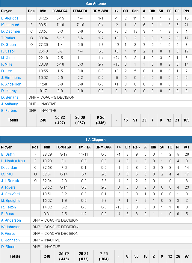 Gêné par les fautes, Kawhi Leonard termine tout de même meilleur marqueur des Spurs, bien aidé par un quatuor Tony Parker (17 points à 5/12), LaMarcus Aldridge (15 points à 5/15 et 11 rebonds), Patty Mills (14 points à 5/10) et Pau Gasol. Ce dernier, de retour de blessure, est sorti du banc pour signer un excellent match avec 17 points et 11 rebonds en 27 minutes. Les Spurs ont été limités à 42.7% au tir mais rentrent 26 de leurs 30 lancers et captent 15 rebonds offensifs pour seulement 12 ballons perdus. En face les Clippers shootent à peine mieux avec un duo Chris Paul (17 points à 6/14 et 5 passes) – Blake Griffin (29 points à 9/17, 9 rebonds et 5 passes) reformé. Austin Rivers brille avec 23 points à 8/14 mais les hommes de Doc Rivers ont eu des difficultés en dernier quart.