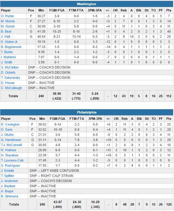 À noter : Timothé Luwawu-Cabarrot signe 9 points à 2/3 et 1 passe en 17 minutes. Ian Mahinmi joue lui 7 minutes seulement en raison de spasmes au dos et termine à 1 point et 3 rebonds. Bojan Bogdanovic, transféré à Washington par Brooklyn, a inscrit 2 points en 18 minutes. Marcin Gortat termine à 11 points et 11 rebonds.
