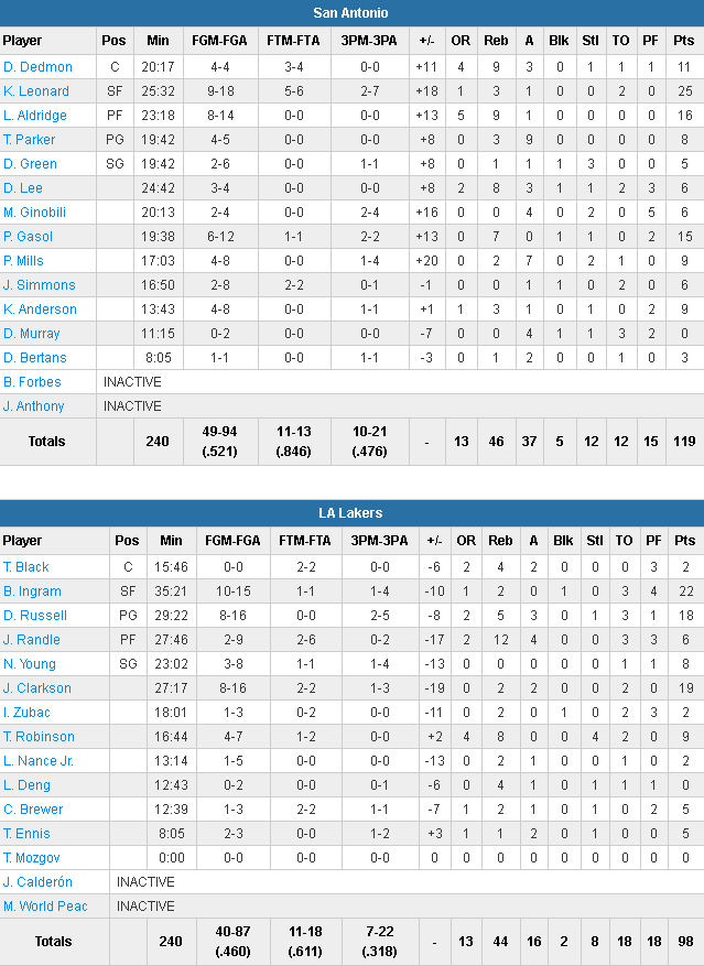 Il n’y a pas eu de match puisque les Texans ont plié la rencontre dès le premier quart, remporté 36-20 avec une démonstration collective. Ils délivrent 37 passes décisives, record de saison, pour 52.1% au tir. Kawhi Leonard termine avec 25 points à 9/18, LaMarcus Aldridge ajoute 16 points et 9 rebonds, Pau Gasol 15 points et 7 rebonds alors que Tony Parker compile 8 points à 4/5 et 9 passes en 20 minutes. Les Lakers sont eux limités à 45.3% et perdent surtout 18 ballons. Brandon Ingram marque 22 points à 10/15, D’Angelo Russell 18 points à 8/16 et Jordan Clarkson 19 à 8/16.