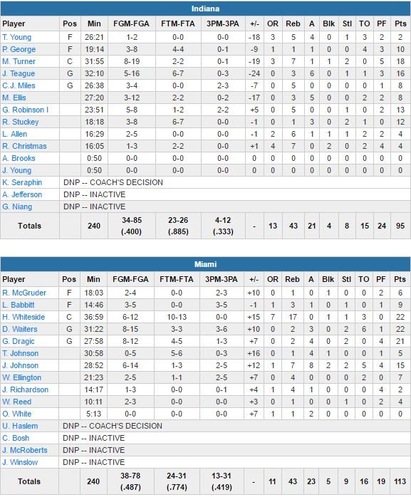 Miami a signé une énorme fin de match (42-22 dans les 16 dernières minutes) pour s’imposer 113-95 face aux Pacers cette nuit. Hassan Whiteside signe 22 points à 6/12 et 17 rebonds, Dion Waiters 22 points à 8/15 et Goran Dragic 21 points à 8/12 et 4 passes pour le Heat.