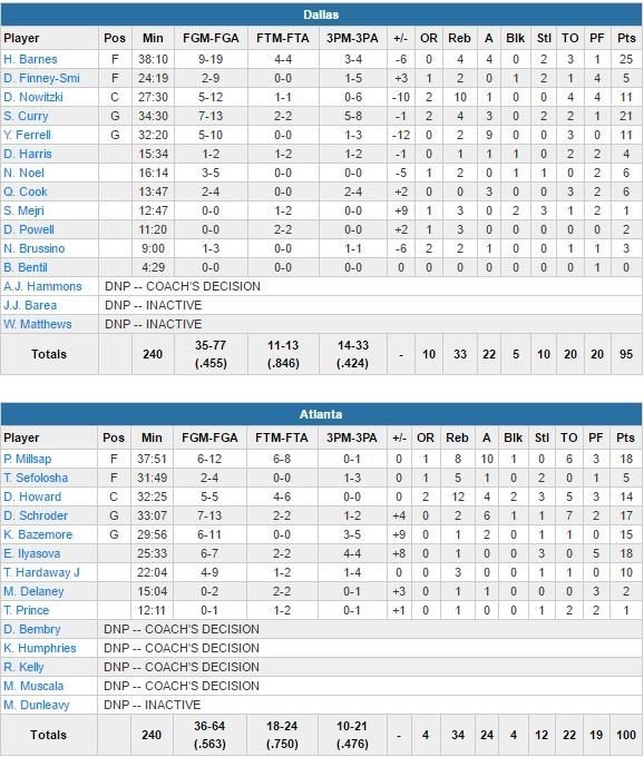 Atlanta s’impose 100-95 après une occasion ratée d’Harrison Barnes (25 points à 9/19, 4 rebonds et 4 passes) de redonner l’avantage à son équipe face à Kent Bazemore. Ersan Ilyasova (18 points à 6/7) obtiendra ensuite la faute de Finney-Smith (contestée par Rick Carlisle après la rencontre) et rentrera 2 lancers-francs pour à 11.1 secondes avant que Seth Curry (21 points à 7/13, 4 rebonds et 3 passes) ne manque une dernière chance de forcer la prolongation et là encore face à un excellent Bazemore en défense, qui partira dunker de l’autre côté pour tuer le match.