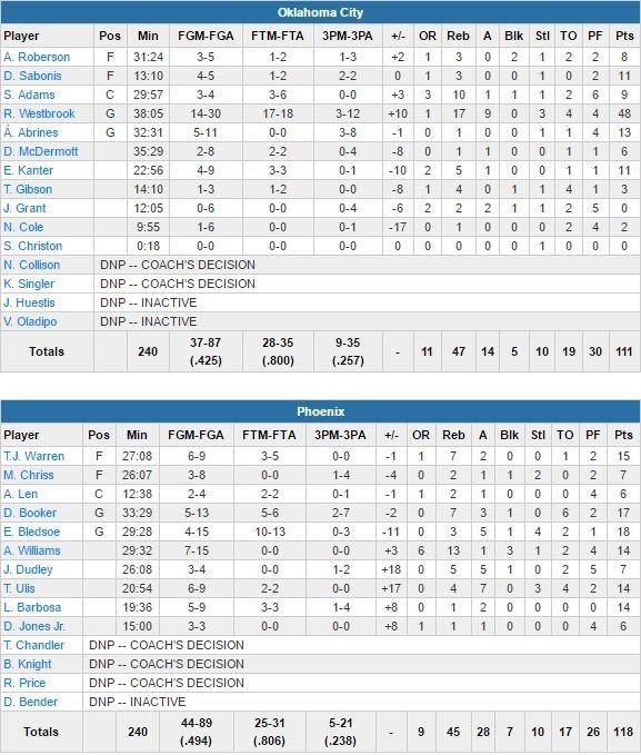 Les Suns sont tout simplement allés trop vite pour le Thunder, battu 118-111 cette nuit pour une 2ème défaite consécutive après Portland jeudi. Menés par Eric Bledsoe (18 points à 4/15, 3 rebonds et 5 passes), un des 6 joueurs (14 points et 13 rebonds pour Alan Williams, 14 points et 7 passes pour Tyler Ulis) à au moins 14 points de Phoenix, les Suns ont ainsi survécu en équipe au nouveau match monstrueux de Russell Westbrook : 48 points à 14/30, 17 rebonds et 9 passes. Phoenix met au passage fin à une série de 6 défaites de rang face à Oklahoma City.