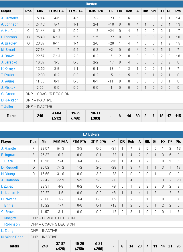 Il n’y a pas eu de match puisque le collectif des Celtics a rapidement fait la différence avec 6 joueurs entre 13 et 18 points. Isaiah Thomas marque 18 points (8 passes), Al Horford 17 points, Jaylen Brown 16 et Avery Bradley 14. L’équipe shoote à 51.2% et marque pas moins de 70 points en première mi-temps. En face seuls 3 Lakers dépassent la barre des 10 points avec 20 unités pour Jordan Clarkson, 17 pour D’Angelo Russell et 13 pour Julius Randle. L’équipe shoote à seulement 42.5% et a pris l’eau en défense.
