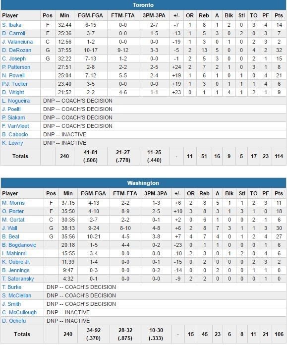 John Wall (30 points à 9/24, 8 rebonds, 7 passes et 3 contres) et Bradley Beal (27 points à 10/21, 7 rebonds et 4 passes) ont répondu présent mais leur équipe ne shoote qu’à 37% et n’a pu compter sur un banc aussi bon que mercredi. Les remplaçants des Raptors, qui ont tout de même laissé s’évaporer une avance de 19 points en 1ère mi-temps, dominent 44 points à 14 sur la rencontre ! Washington réussira à repasser devant 72-71 sur un 3-points de Beal mais DeRozan va donner pour de bon l’avantage aux siens 76-74 sur un jump shot ligne de fond en fin de 3ème quart. Les Wizards reviendront à une possession grâce à Wall de loin (108-105) dans la dernière minute mais là encore DeRozan répondra, cette fois à 3-points, à 20.9 secondes du buzzer.