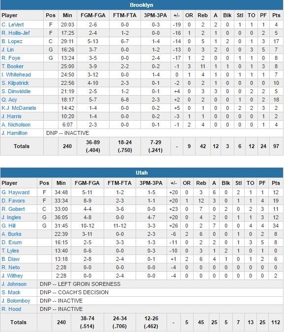 Quincy Acy bat son record en saison avec 18 points, Brook Lopez termine à 17 points pour Brooklyn, qui encaisse 38 points dans le 1er quart-temps avant de se retrouver mené 60-51 à la mi-temps. Hill et Derrick Favors combinent pour 25 points dans le 1er quart-temps, durant lequel Utah a shooté à 65% !