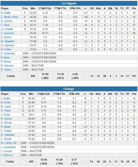 Les Bulls vont conserver cette avance à 5 reprises dans la période mais les Clippers vont prendre le contrôle dans le 3ème quart. Crawford plante un long 3-points au buzzer qui conclut un 18-5 en faveur de Los Angeles, 82-73. L’écart passera ensuite à 16 points (96-80) en milieu de 4ème.