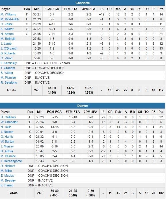 Frank Kaminsky out (épaule), les Hornets avaient besoin d’un coup de pouce et il est venu de Johnny O’Bryant (23 ans, 2,06m, signé pour 10 jours fin février), 15 points (record en carrière). L’intérieur est venu en aide à Kemba Walker (27 points à 8/21, 4 rebonds et 4 passes), Nicolas Batum (21 points à 7/11 et 8 passes) et Marvin Williams (14 points à 5/7, 12 rebonds et 3 passes) pour une victoire 112-102 à Denver.