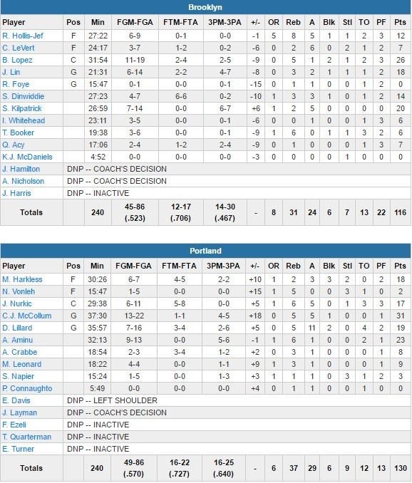 Avec un joli 16/25 à 3-points et un 57% global aux tirs devant son public cette nuit, Portland n’a pas eu besoin de forcer pour venir à bout des Brooklyn Nets, 130-116. C.J. McCollum signe 31 points à 13/22, 5 rebonds et 5 passes, Damian Lillard ajoute 19 points à 7/16, 11 passes et 2 contres.