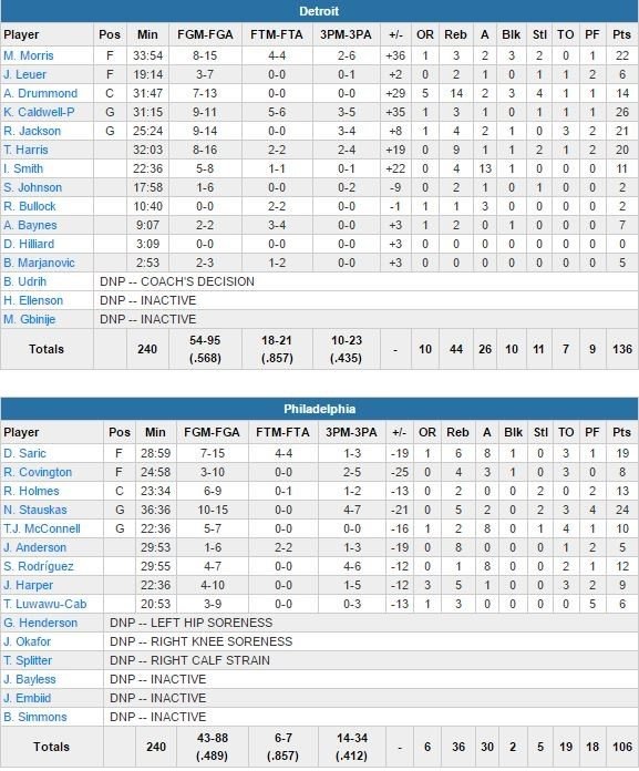 Sans Joel Embiid (genou, saison), Ben Simmons (pied, saison) et Jahlil Okafor (genou, deuxième match manqué), les Sixers de Nik Stauskas (24 points à 10/15 et 5 rebonds) et Dario Saric (19 points à 7/15, 6 rebonds et 8 passes) se sont inclinés 136-106 face aux Pistons cette nuit.