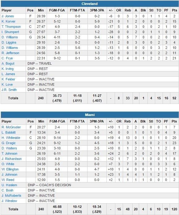 De passage à Miami, les Cavaliers (42-19) avaient décidé de laisser LeBron James et Kyrie Irving au repos cette nuit. Il n’en fallait pas plus au Heat (29-34), en quête de victoire après une défaite à Orlando, pour s’imposer 120-92 dans le sillage de Goran Dragic (23 points à 9/12 et 5 passes) et Hassan Whiteside (20 points à 9/14 et 13 rebonds). Tyler Johnson ajoute 17 points dans cette 18ème victoire en 22 rencontres pour les Floridiens.