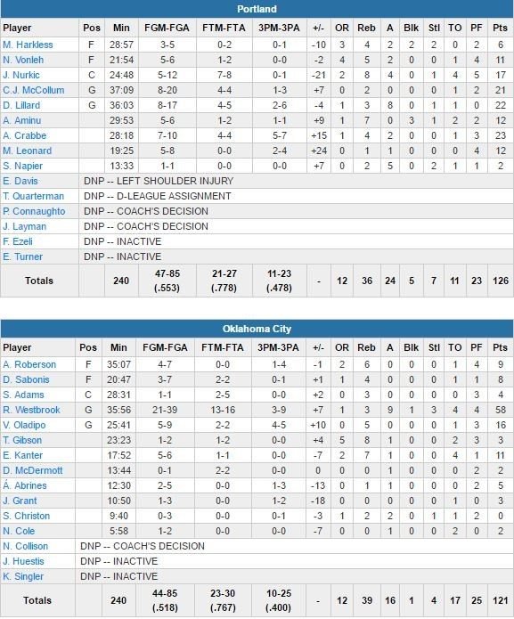 Le Thunder à la traîne 122-119, Westbrook manque une tentative à 3-points. Nurkic enchaîne avec 2 lancers-francs réussis à 9.8 secondes puis Westbrook trouve un layup rapide pour ramener son équipe à 3 points à 4.5 secondes. Lillard n’aura ensuite plus qu’à assurer la victoire avec 2 lancers-francs à 1.4 seconde du buzzer.