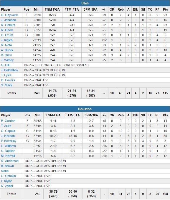 À moins de 3 minutes de la fin, Harden ramène encore son équipe à 4 points, 103-99. Houston est toujours à 4 points une minute plus tard suite à un échange de lancers-francs mais Joe Johnson à 3-points redonne 7 points d’avance au Jazz, 110-103. Trois lancers d’Harden permettent à Houston de rester dans le match mais Patrick Beverley manque ensuite un layup après une interception d’Eric Gordon, et Gobert tue le match avec un layup (112-106) à moins d’une minute de la fin.