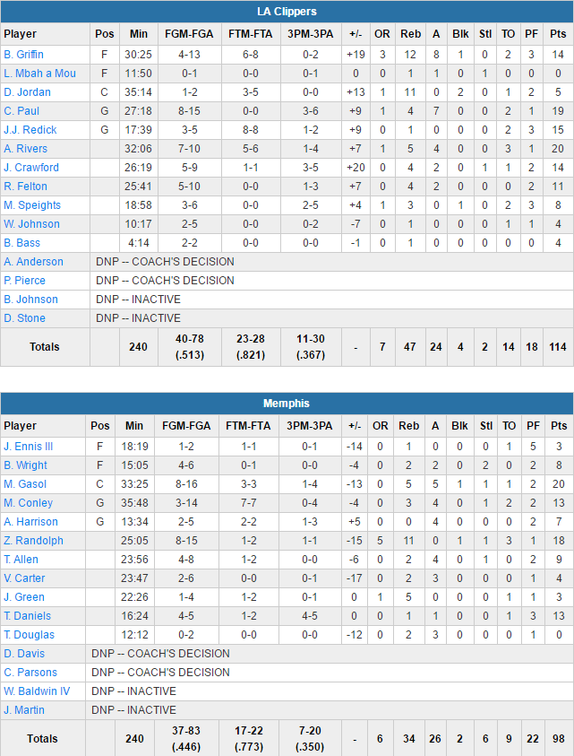 Le match a été plié en 3 quart temps puisqu’après 17 minutes très équilibrées durant lesquelles aucune équipe n’a fait le moindre break, les Grizzlies ont craqué en fin de mi-temps. JJ Redick et Jamal Crawford ont permis aux Clippers de passer un 11-0 pour se retrouver en tête à la pause 54-45. Cet écart a progressivement augmenté au retour des vestiaires, le collectif des Clippers prenant le dessus sur celui des Grizzlies avec un quart remporté 31-20 sous l’impulsion du duo Griffin – Paul, qui a inscrit 19 points. Résultat à l’entame des 12 dernières minutes LAC menait tranquillement 85-65. Jamais Memphis n’a pu revenir et emballer la rencontre.