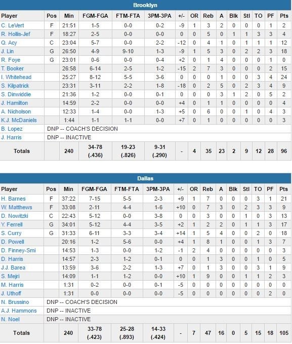 Dallas s’est logiquement imposé 105-96 face à des Nets néanmoins plutôt accrocheurs cette nuit. Harrison Barnes signe 21 points et Dirk Nowitzki, discret en début de match, est venu planter deux gros 3-points en début de 4ème quart pour redonner un avantage définitif aux siens.