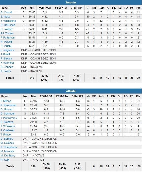 À noter : Jonas Valanciunas termine à 11 points et 12 rebonds. Serge Ibaka, sorti pour 6 fautes à 1’38, signe 18 points. Dwight Howard est lui en double-double avec 16 points et 10 rebonds. Malgré un apport de 0 point du banc, les Hawks (21 ballons perdus, soit 10 de plus que Toronto !) ont mené 49-48 à la pause.