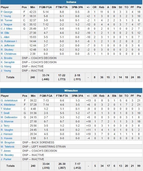 Avec sa victoire 99-85 contre les Pacers cette nuit, Milwaukee s’offre sa meilleure série de la saison avec un 5ème succès consécutif. Les hommes de Jason Kidd passent en 8ème position devant les Bulls. Giannis Antetokounmpo (7/13, 8 rebonds 5 passes et 5 interceptions) et Khris Middleton (7/14, 3 rebonds) ont chacun inscrit 21 points tout en étant aidés par 2 joueurs à au moins 10 points (18 pour Jason Terry et 10 pour Tony Snell) et un John Henson à 8 points, 7 rebonds et 4 contres.