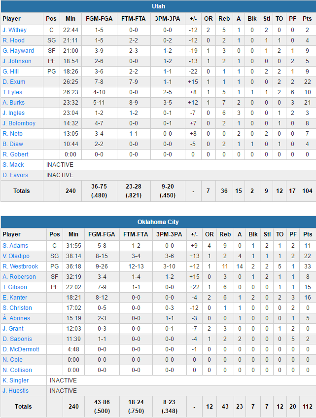 Westbrook a compilé 33 points à 9/26, 10 rebonds, 14 passes (il n’a pourtant pas fait la moindre passe et capté de rebond en dernier acte) et 2 contres en 36 minutes, soit son 32ème triple-double de la saison, ce qui lui permet de dépasser la marque de Wilt Chamberlain en 1967-68. Désormais il va tenter d’aller chercher Oscar Robertson et ses 41 triple-doubles. Le meneur a impliqué ses coéquipiers et OKC a réalisé une belle prestation offensive (50% au tir) face à une des meilleures défenses de la ligue, si ce n’est la meilleure. Victor Oladipo inscrit 22 points, Taj Gibson 15 points, Enes Kanter 16 points et Steve Adams 11 points. Privé de Rudy Gobert, le Jazz est une équipe totalement différente, qui a été dominée à l’intérieur. Aucun titulaire du Jazz n’a atteint les 10 points et c’est le second 5 qui a fait le job. Gordon Hayward signe seulement 9 points à 3/9 tandis que George Hill ajoute 9 points à 3/6. Dante Exum sort sa meilleure performance en carrière avec 22 points à 7/8. Alex Burks signe lui 21 points à 5/11.