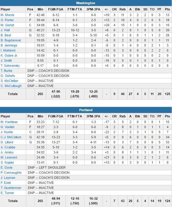 Damian Lillard (33 points à 13/27 et 7 passes) avait donné l’avantage 120-117 aux Blazers en prolongation avant un layup de Wall et une claquette de Marcin Gortat (15 points à 6/8 et 15 rebonds) pour permettre aux Wizards de reprendre l’avantage. Lillard va à nouveau répondre avec un floater et un layup pour le +3 à 35.7 secondes. Juste avant le shoot controversé de Morris, Beal obtient 3 lancers-francs et en réussit 2. Wall contre ensuite un shoot de Lillard (aidé p pour offrir à Morris le shoot de la victoire. Son public toujours en train de réclamer l’annulation du panier, Lillard manque une derière tentative en déséquilibre à 3-points.
