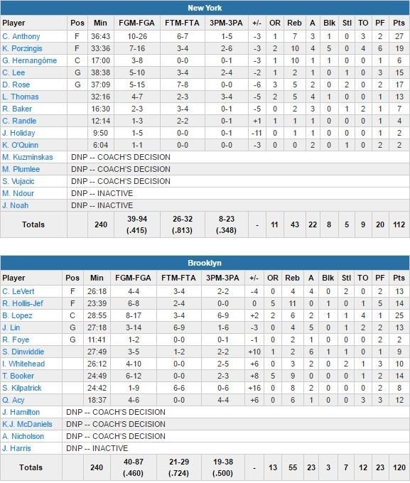 De retour d’un road trip de 8 matchs (2 victoires pour 6 défaites, ils n’avaient plus joué à domicile depuis le 15 février), les Nets sont menés par un Brook Lopez à 25 points à 5/17 et 6/9 à 3-points et 6 rebonds. Côté Knicks, Carmelo Anthony a démarré doucement et termine à 27 points (il a passé la barre des 10 000 points sous le maillot de New York à l’occasion) à 10/26, 7 rebonds 3 passes tandis que Kristaps Porzingis est en double-double avec 19 points et 10 rebonds et Derrick Rose à 17 points.